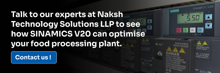 As a leading Siemens authorised dealer, bring expertise to your food process plant. Our Ahmedabad-based team, with a global reach from the UAE to Mexico, delivers SINAMICS V20 solutions to meet your requirements. Naksh Technology Solutions LLP is your partner for Siemens V20 Solutions. We provide world-class automation expertise from Ahmedabad to the world. Looking to update your plant? Contact us today to see how we can power your success!
